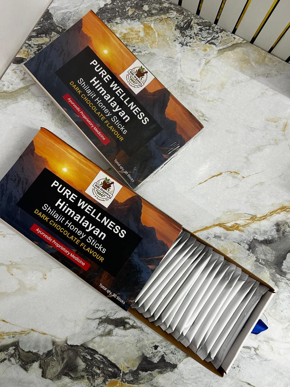Pure Wellness Shilajit Honey Dark Chocolate sticks / 30 Sachets for Men & Women's .Balancing hormones, boosting energy, and improving bone density. Rich in fulvic acid and minerals, it helps reduce PMS symptoms, supports fertility, eases fatigue, and aids in managing stress. It further supports skin health, improves metabolic rate for weight management, and strengthens immunity.
